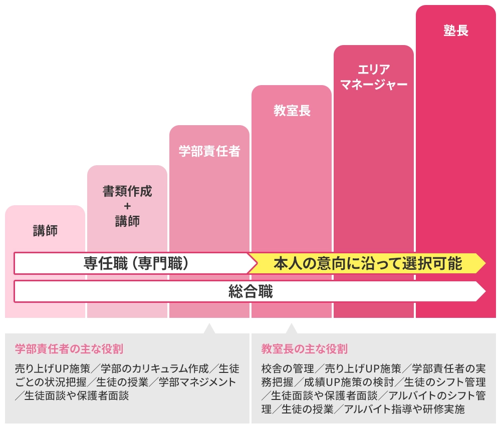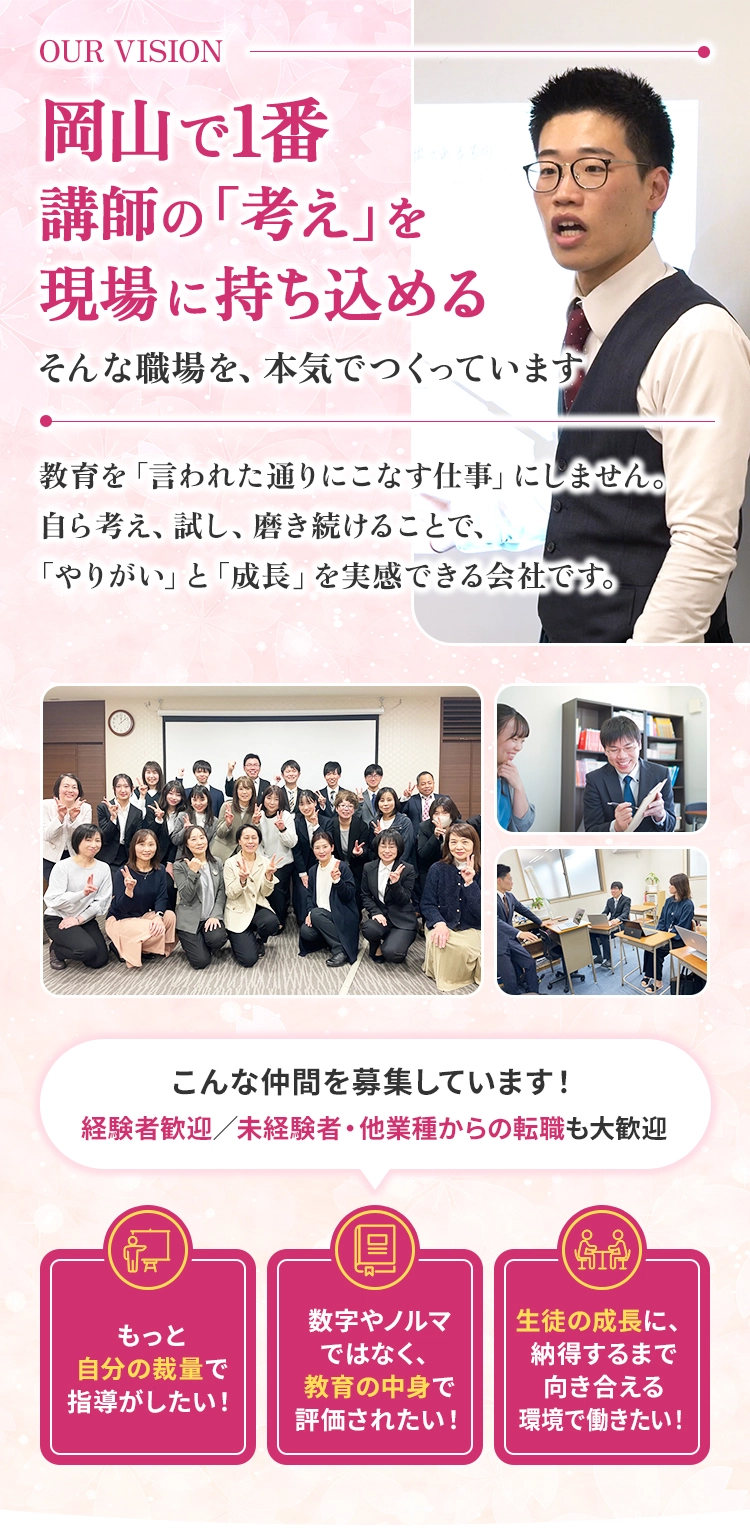 教育というフィールドで、生徒さん・保護者様・地域にとって「なくてはならない存在」であること。そこで働く一人ひとりが、日々の仕事を通じて、自分の仕事にやりがいを感じながら、人として成長していけること。