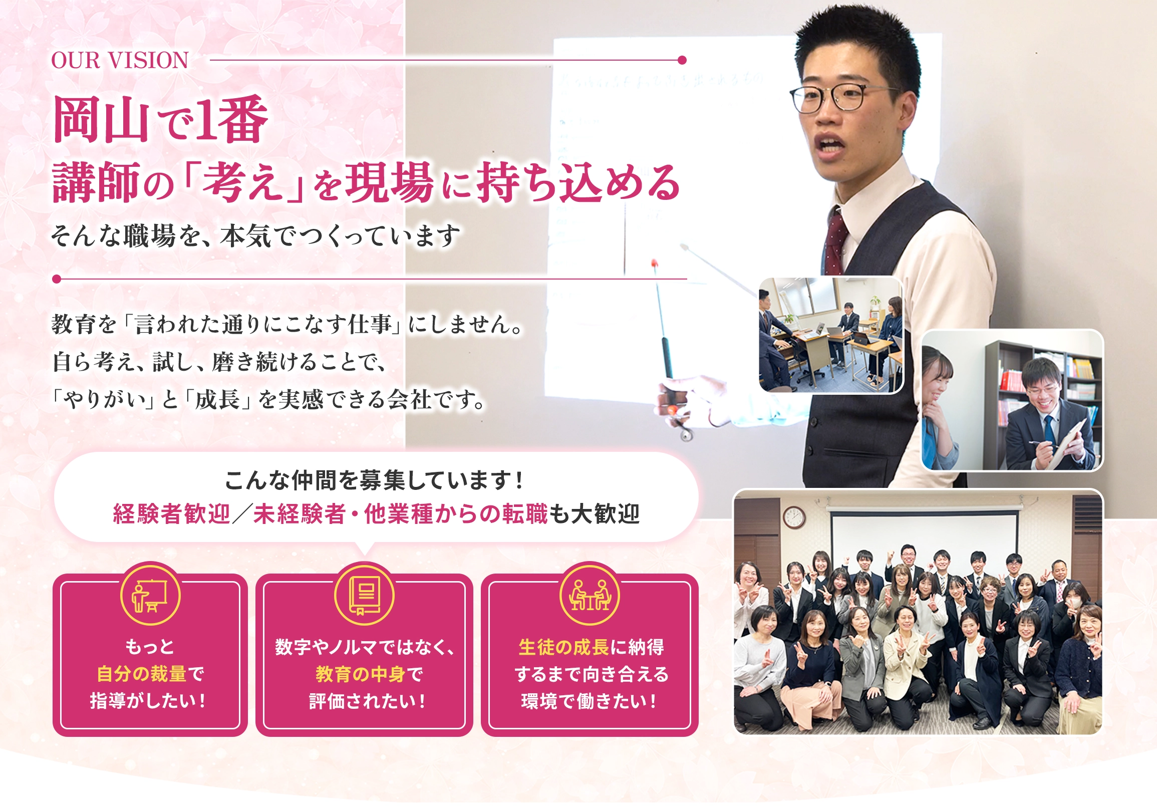 岡山No.1の「やりがい」×「成長」私たちはこのフレーズに、会社としての想いをすべて込めています。弊社は、岡山でいちばん「やりがい」と「成長」を実感できる会社でありたいと考えています。